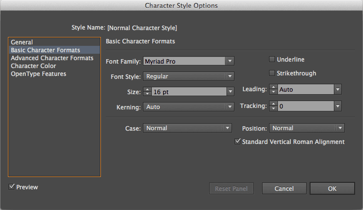 Adobe Illustrator Character Style Options dialog box