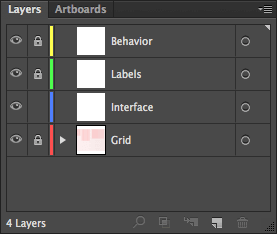 Besides organizing the content in a document, layers can have their visibility toggled on or off. This is beneficial when exporting the artwork for documentation as I prefer to have four layers in my wireframe document for this exact purpose. The bottom layer is for the grid, then the wireframe interface, followed by element labels, and finally a description of each element’s behavior. Each layer is appropriately named Grid, Interface, Labels, and Behavior.