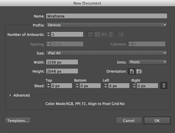 Illustrator gives you a plethora of options when creating a new document, one of those is canvas size. The “New Document” dialog box, gives Profile options including Web and Devices. There are several predefined selections within each option for smartphone, tablet, or desktop browser size. These default settings are preconfigured with the appropriate Units (pixel) and Screen DPI (72 dpi).