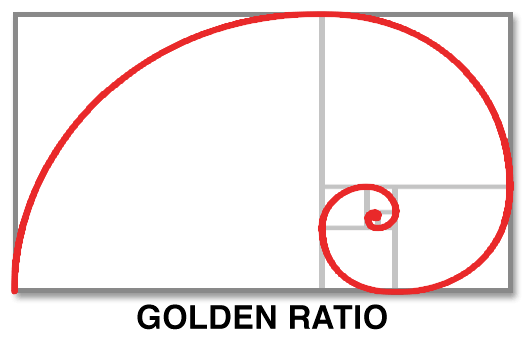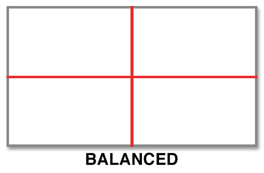 A critical but hidden element of design is the grid. Grids are used to align objects or points of interest to create an implied sense of structure on the canvas. The Balanced grid is accomplished by centering all objects either vertically or horizontally on the canvas. The Rules of Thirds grid creates two vertical and two horizontal lines across the canvas, dividing the canvas into thirds. The Golden Ratio is often found in nature and believed to be the most aesthetically pleasing grid. Based on the Golden Rectangle (The long side of the rectangle divided by the short side is mathematically equal to the Golden Number 1.618), the Golden Ratio creates a spiral arch when a line is drawn through the intersecting points leaving a focal point in one third of the canvas.